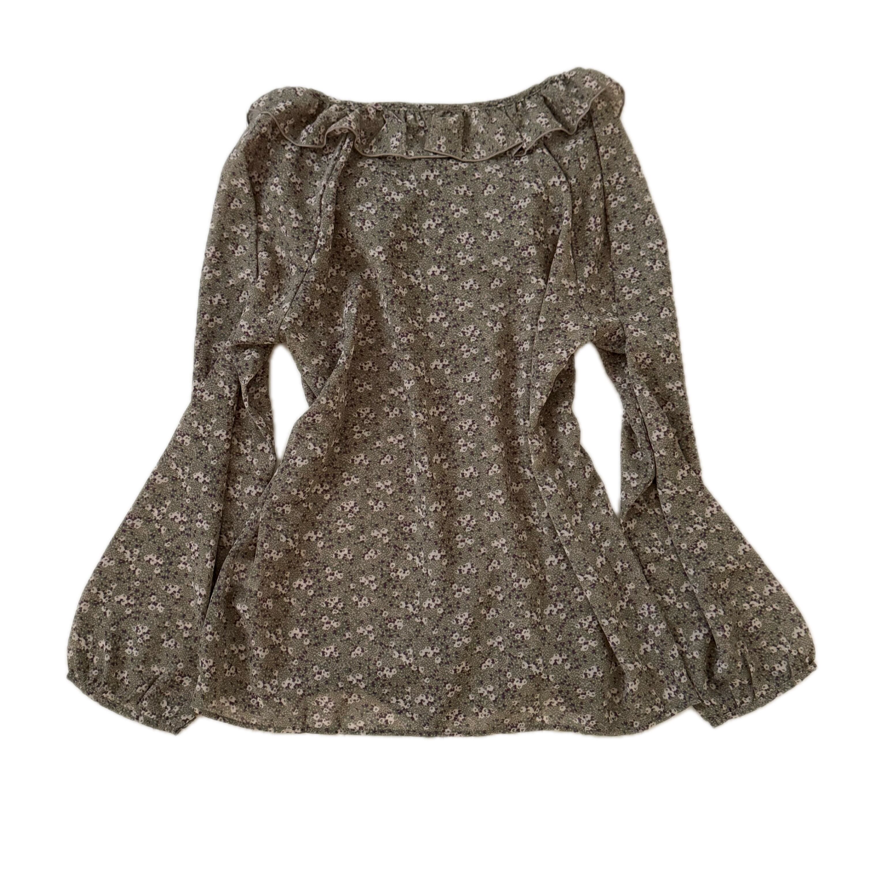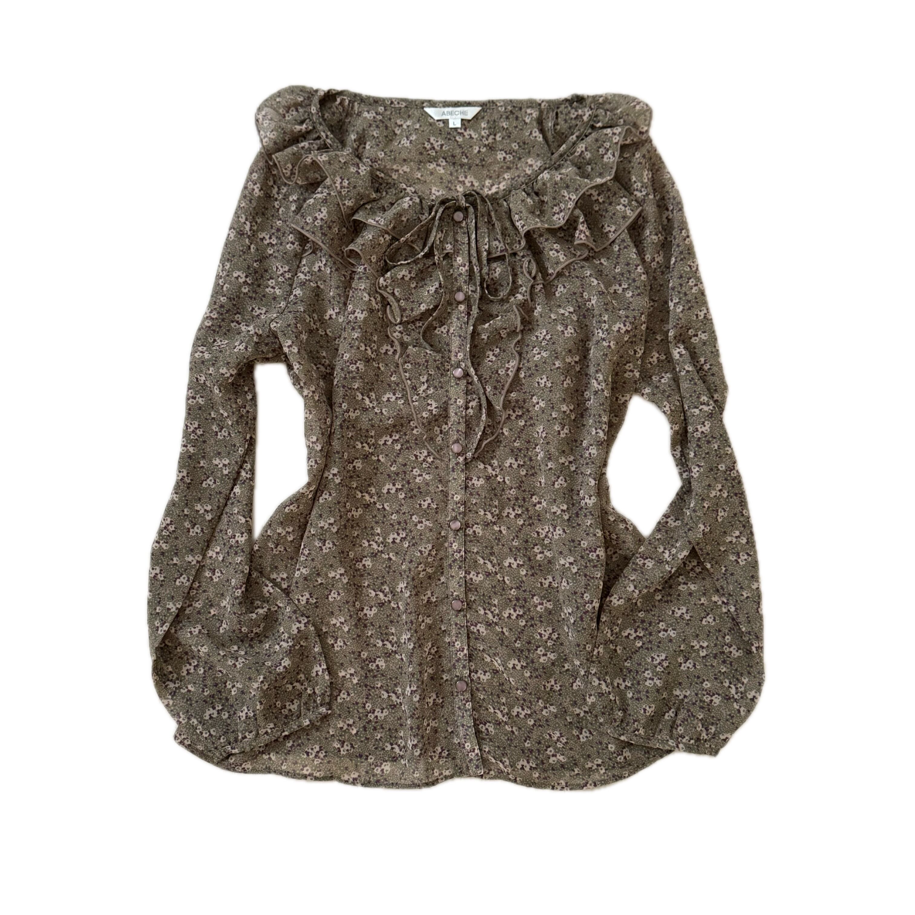 カーキ系の配色に花柄が特徴で、フリルのネックラインが女性らしさを引き立てます܀ꕤ୭*